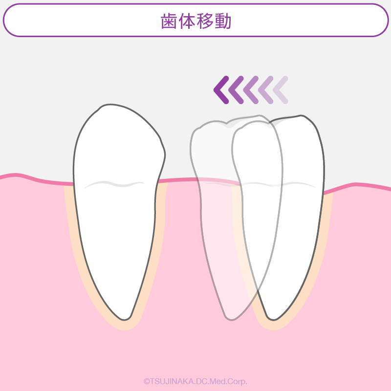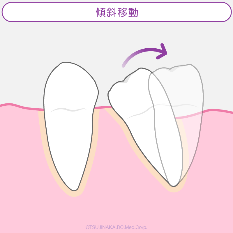 歯根はあまり動かさずに歯冠(歯の頭)が動きます。抜けた歯を放置して隣りの歯が倒れている場合などに有効です。