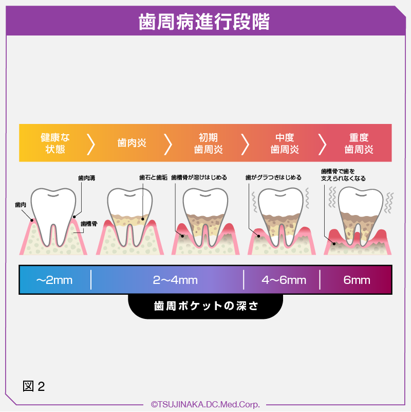 歯周病には進行の段階があります。図2を見ていただきますと、歯周病が進行していくと最後は歯が抜け落ちてしまいます。